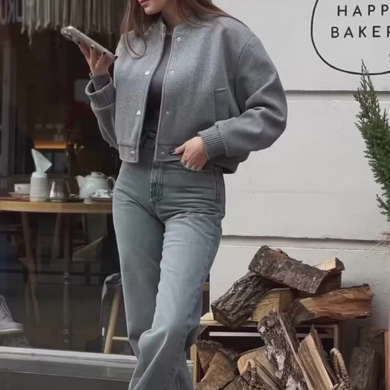 Crafted from a soft, heathered POLYESTER fabric in a versatile mid-grey, this jacket is designed for comfort. It features a sleek O-neck collar, classic ribbed trims, and a practical snap button (listed as zipper in specs, but snap visible in image - clarifying snaps as visual is key!) front closure. The short, loose fit makes it the perfect layer for defining your waist over high-waisted pants or skirts.